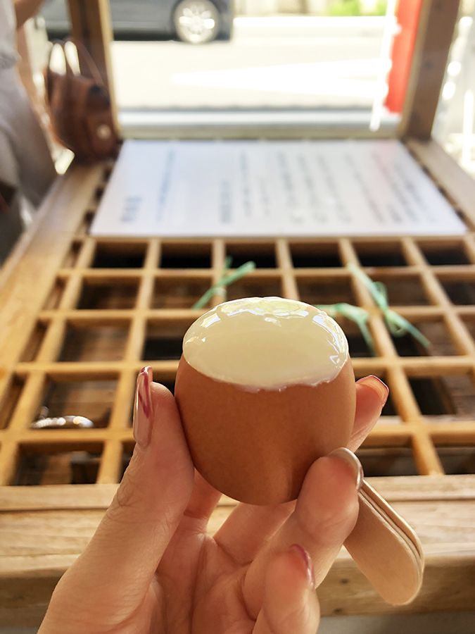 (写真:城崎で食べた温泉卵です。ゆで時間を短くしたので、とろっとろです〜♪)