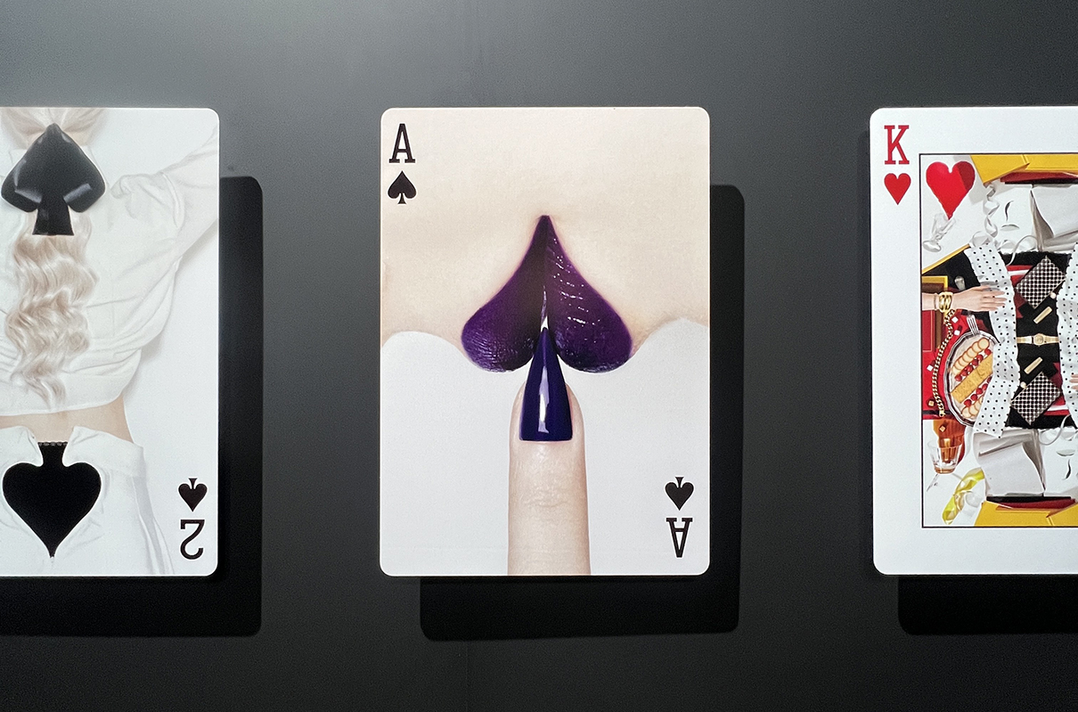 深い紫色に染められた唇とソリッドで光沢のある爪でスペードを表現。