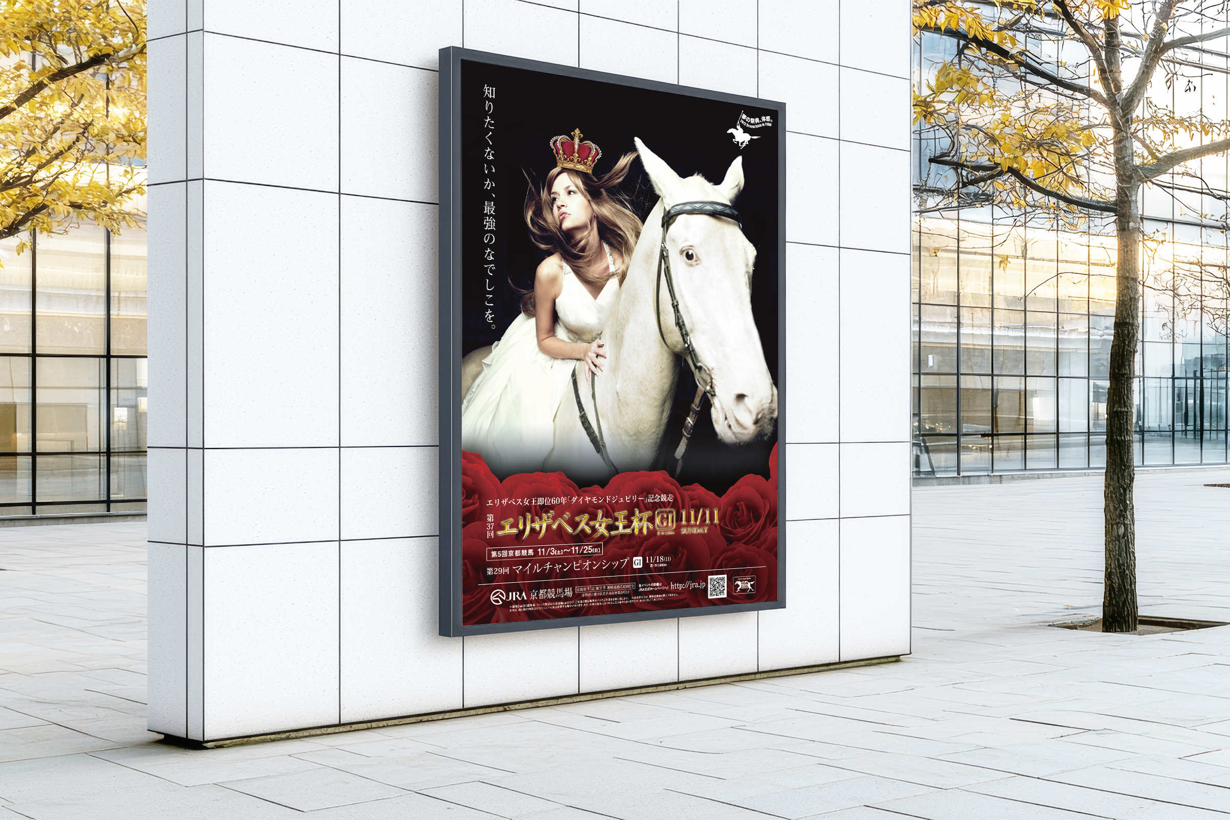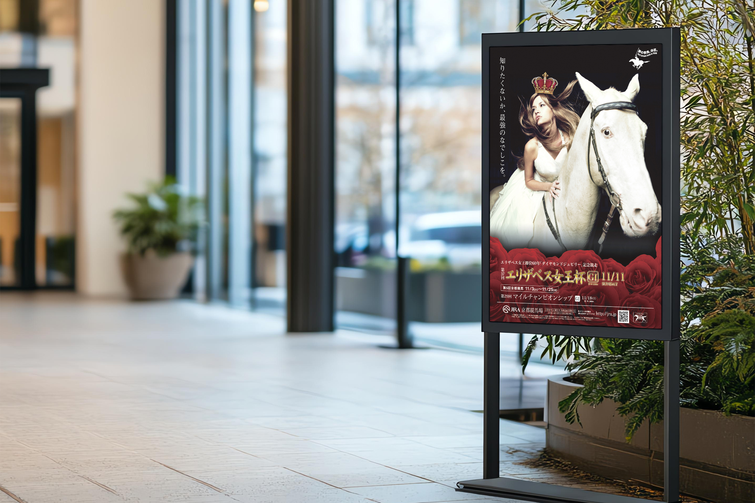 キービジュアルはレース名に由来する「女王と馬」をベースに制作。馬、女性、クラウンなどレタッチを駆使しながら制作し、勢いのあるキャッチコピーとともに躍動感とエレガントな装いを表現。