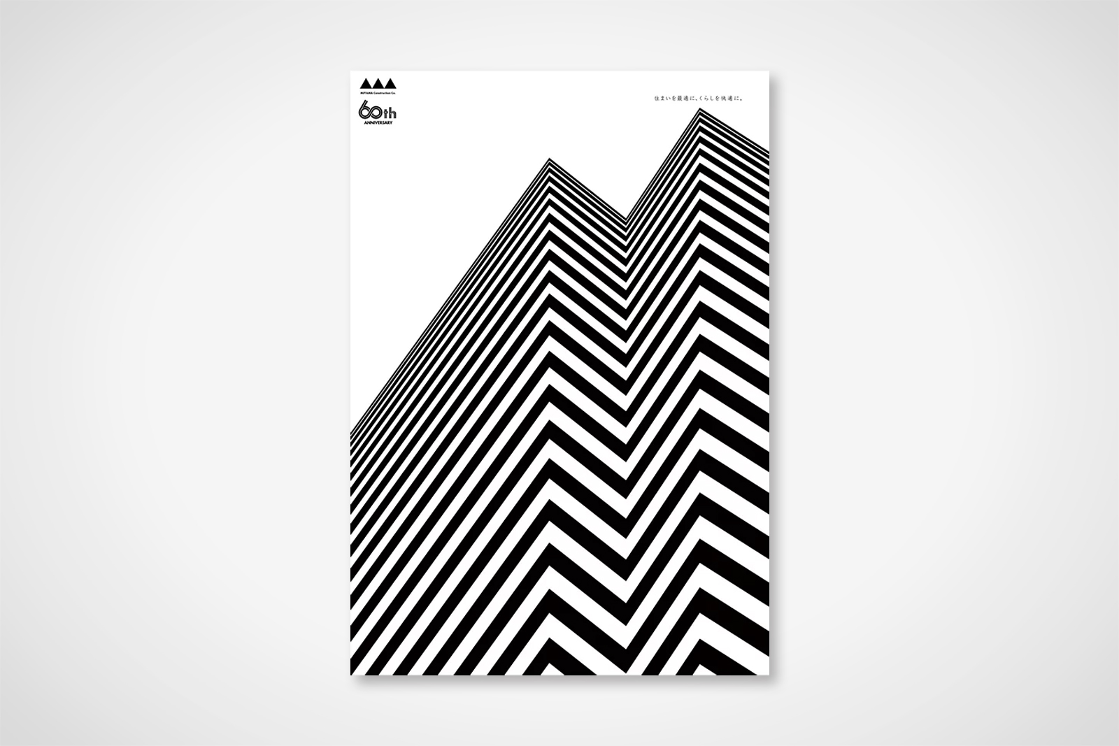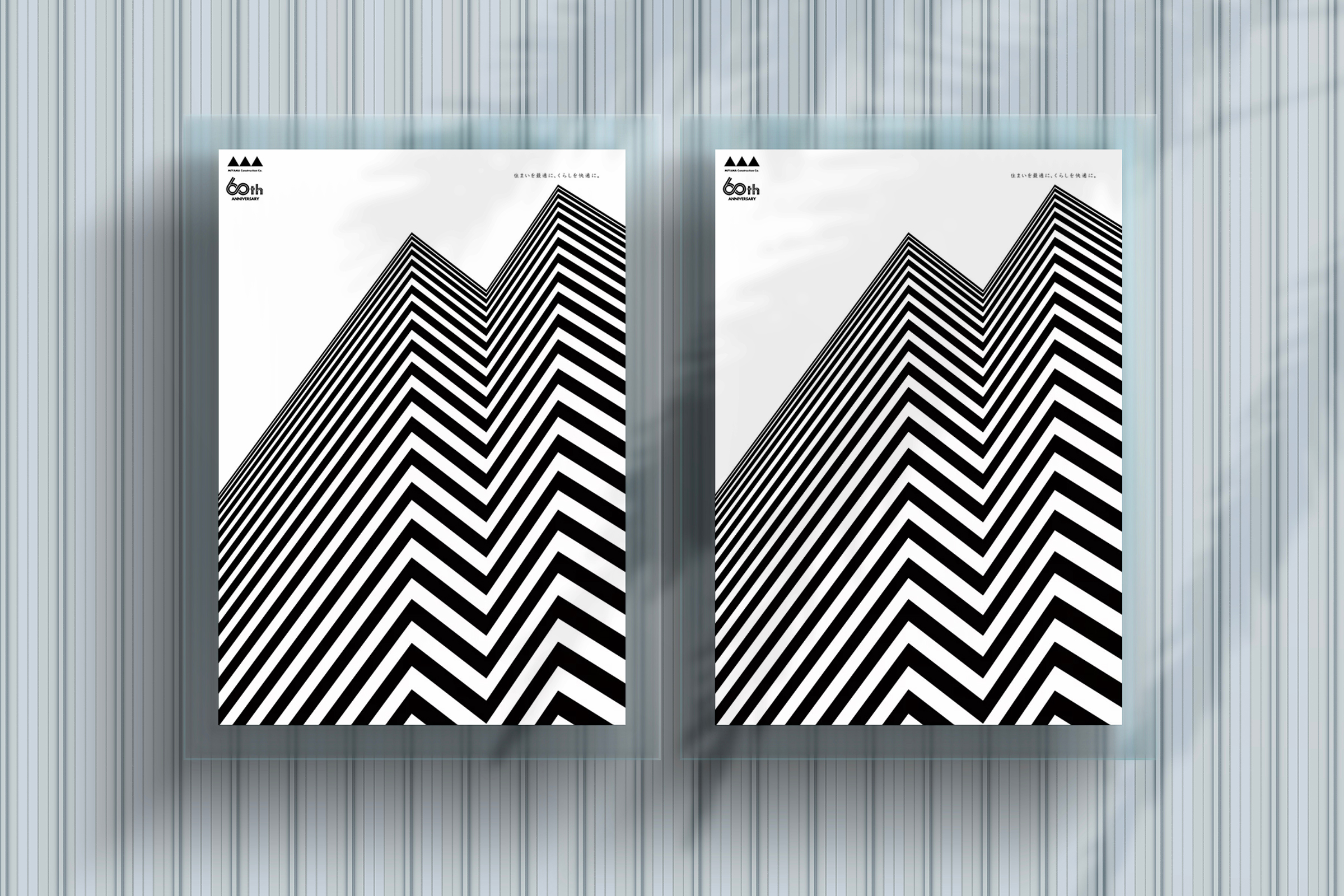 建設とは細かい計算の積み重ねの上で安全な建物が出来上がっているということから、三山建設の頭文字「M」をモチーフにジオメトリックの手法で制作。遠近法を計算し、ビルを下から見上げた幾何学模様で表現しています。